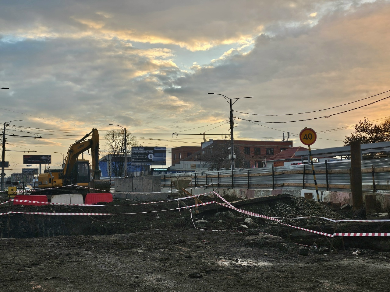 На противоположной, четной стороне, пока виден только котлован. Стоит экскаватор, территория огорожена, также ее опоясывает сигнальная лента. Четверо рабочих что-то пилили наверху.