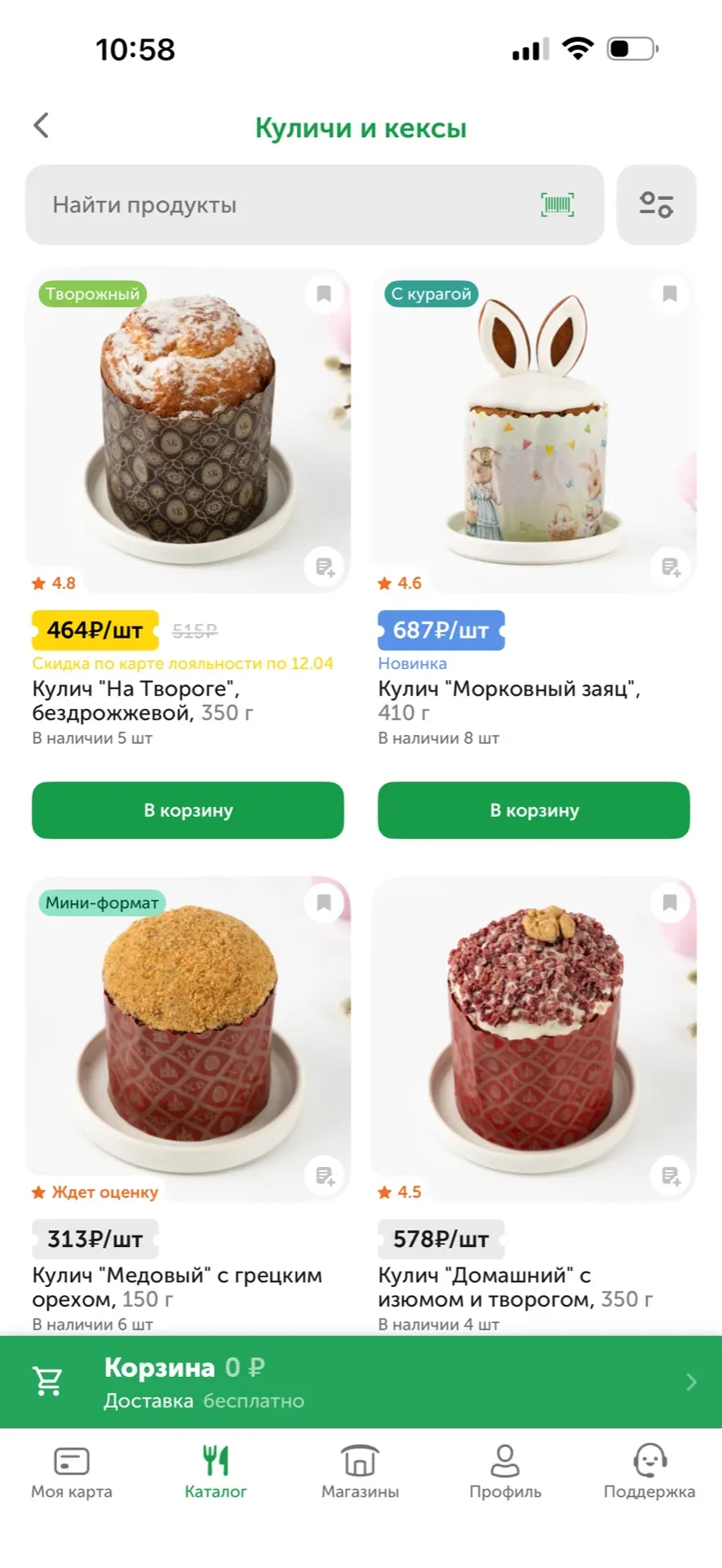 В магазине «Вкусвилл», который обещает, что делает упор на качественный состав, разгуляться можно ещё круче. Шоколадно-ореховые начинки, кокосово-сливочные, цитрусовые с маком. Кулич-медовик с грецким орехом, с рикоттой или шапочкой, из которой торчат заячьи ушки.