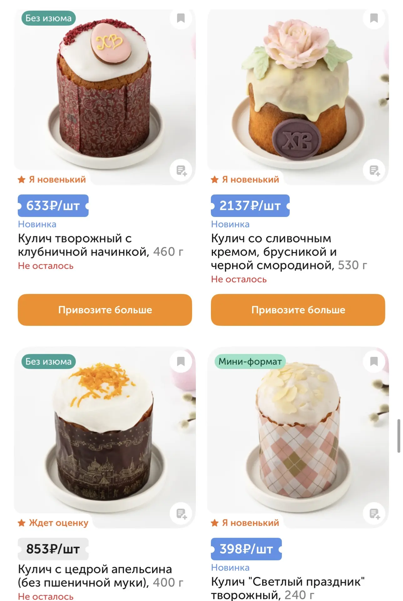 Сейчас, конечно, на полках магазинов можно встретить удивительные вкусовые сочетания, которые ушли за рамки привычного рецепта кулича. Так, в «Пятёрочке» продаются куличи с начинками тирамису, шоколадной, вишнёвой. 180 грамм - 156 рублей.