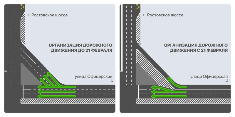 Эти изменения должны увеличить пропускную способность Колхозной и Офицерской улиц, а ещё позволить лучше выпускать вечерний трафик с улицы Красной на Ростовского шоссе.