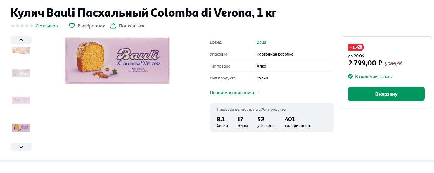 «Пятерочка» предлагает самый скромный выбор куличей. Самый дорогой там обойдется в 549,99. Это творожный кекс с цукатами и вишней весом 450 граммов. Самый дешевый праздничный кекс в этой сети стоит 49,99 – классический, вес 100 граммов.