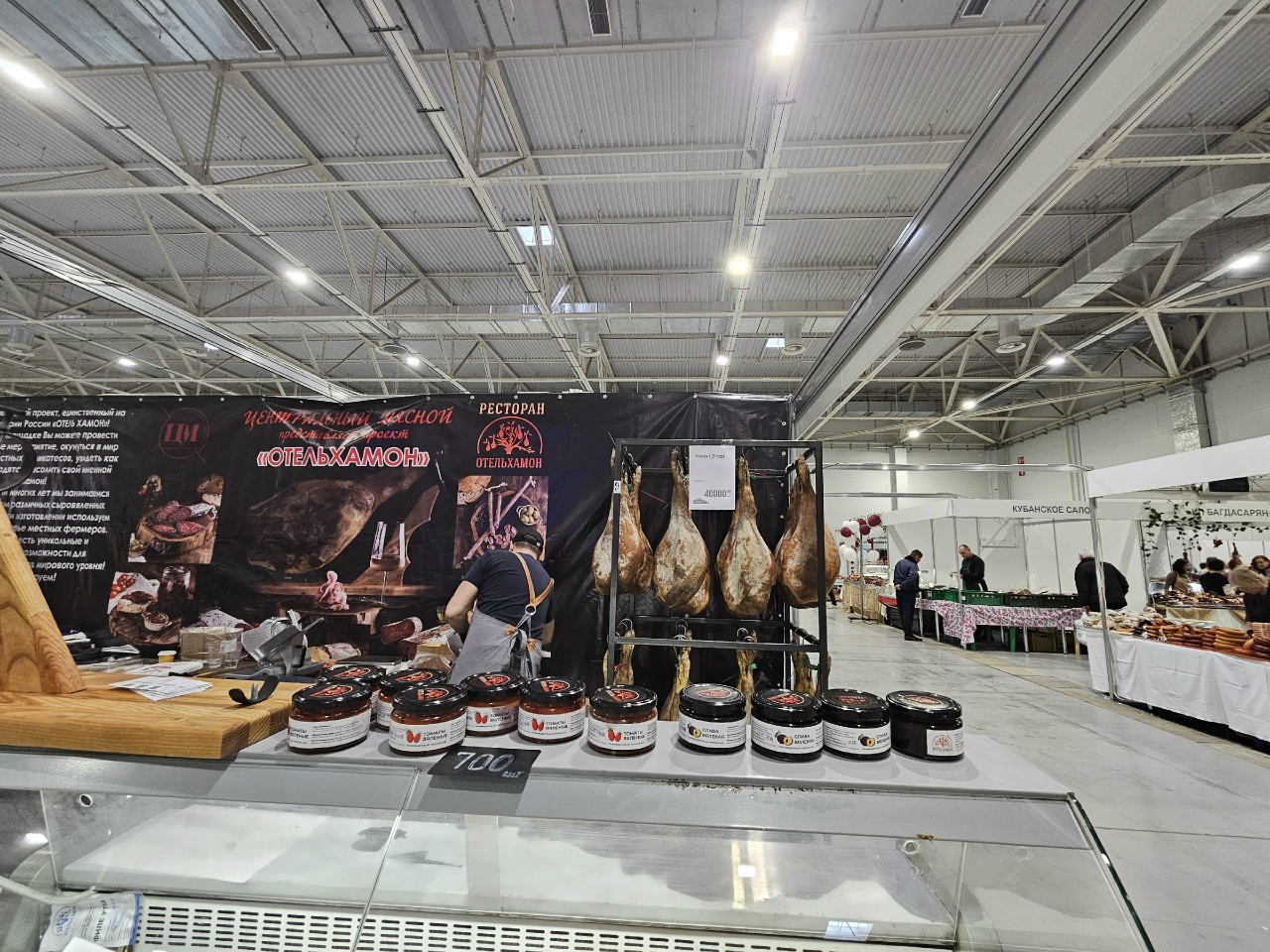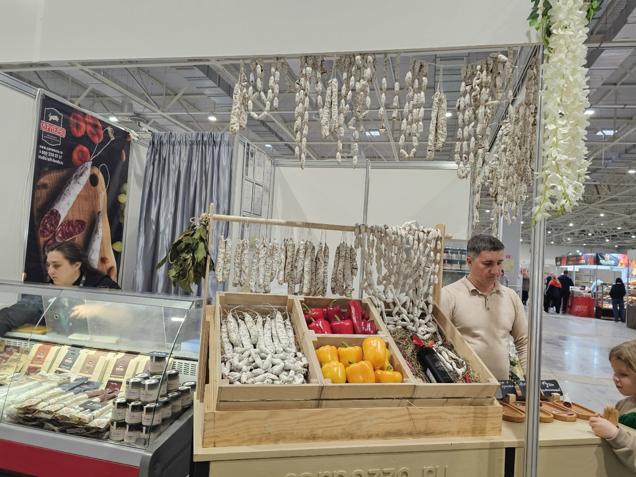 Деликатесы из Красноармейского района Кубани привезла компания «Карнеззо». Так, на витрине были представлены колбасные изделия весом 100-150 граммов по цене 200-300 рублей. Посетителям выставки предлагали попробовать мясной продукт. Представитель фирмы рассказал, что он правильно называется «Ланганиза» – сыровяленая колбаса по испанскому рецепту. Готовится она из свиной лопатки.
