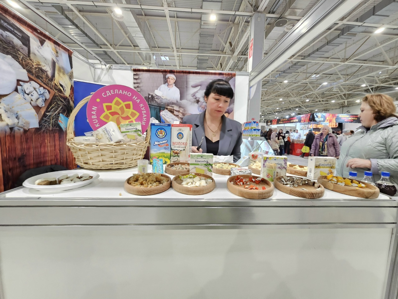«У нас в ассортименте 270 видов продукции. Наша гордость – это производство сыров с плесневой культурой. Наши новинки – яркие сорта камамбера. Камамбер с куркумой, он желтого цвета, камамбер винный, в этот сыр мы добавляем вино, продукт получается очень красивым. Камамбер песто – зеленый насыщенный, камамбер паприка. Привезли сыры с голубой плесенью, сыр «Пиканте», который созревает от 6 месяцев до 3-х лет. И чем он старше, тем насыщеннее», – говорит Алена Барченкова, начальник отдела маркетинга и рекламы фирмы «Калория».