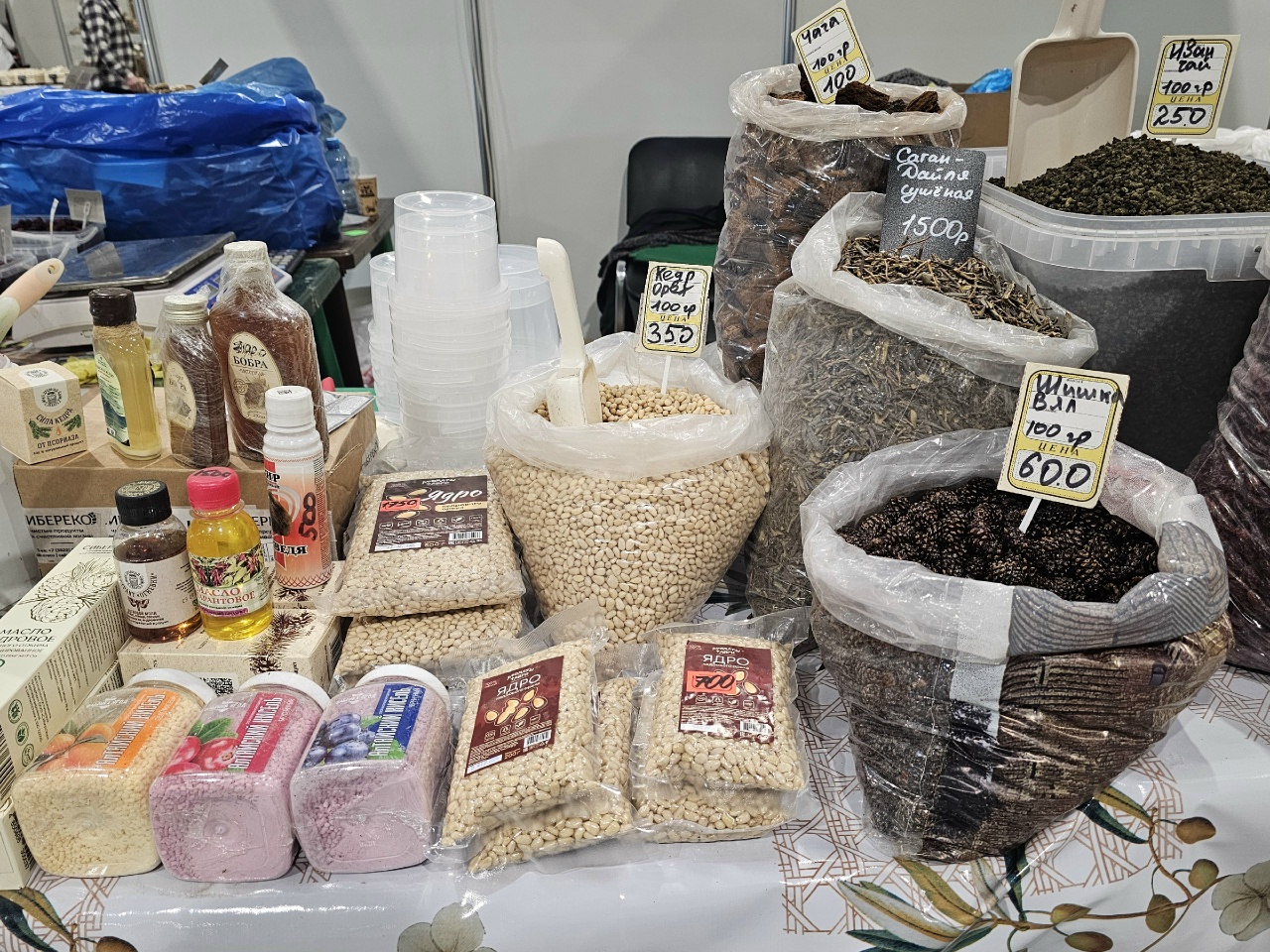 Из Брюховецка привезли сыродавленные масла, в том числе и такие, которые в обычном магазине купить не получится. Семейное предприятие производит масла расторопши, льняное, тыквенное – оно самое дорогое, 600 рублей за бутылочку объемом 250 мл. Также, на ярмарке были представлены различные салатные заправки из масел и специй, например с чесноком и душистыми травами.