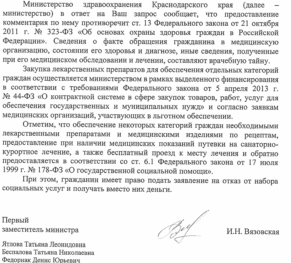 Так было и на этот раз. В ответе Минздрава, подписанном первым заместителем министра И.Н. Вязовской, в частности, говорится, что все сведения, касающиеся состояния здоровья и лечения пенсионера Найденова, являются.. «врачебной тайной». Остальной текст ответа совершенно формален - это просто перечисление законов, на основании которых льготникам предоставляются лекарства. Существенная приписка есть лишь в самом конце. Там говорится, что если получателя препаратов что-либо не устраивает, то он может отказаться от помощи государства, и покупать препараты за свои деньги.