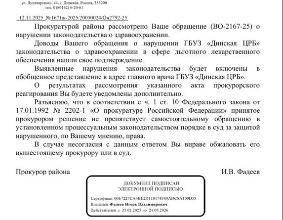 UPD: Поступил официальный ответ из Динской районной прокуратуры. В нем сказано, что сведения, изложенные в обращении Олега Найденова, «нашли свое подтверждение». Ведомство намерено внести представление на этот счет в адрес главврача Динской ЦРБ.