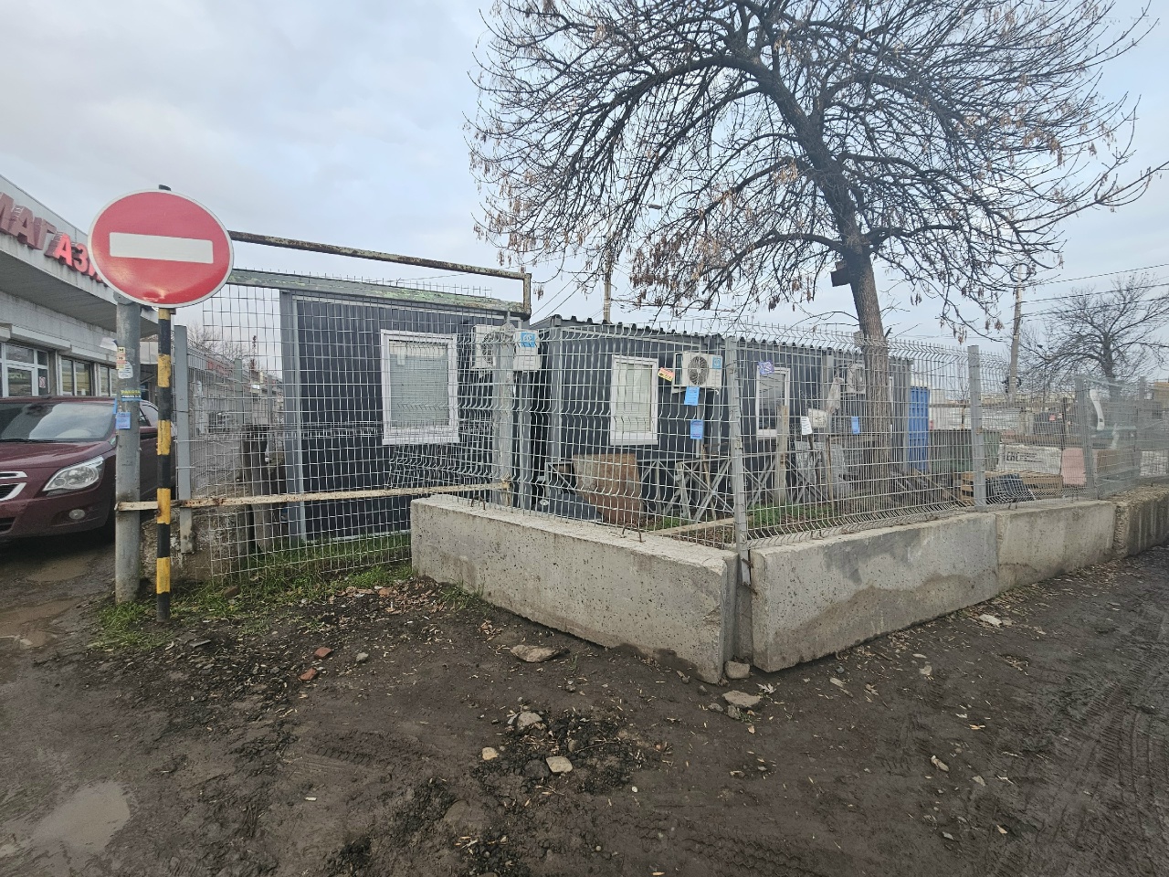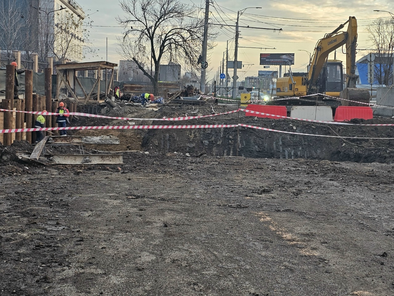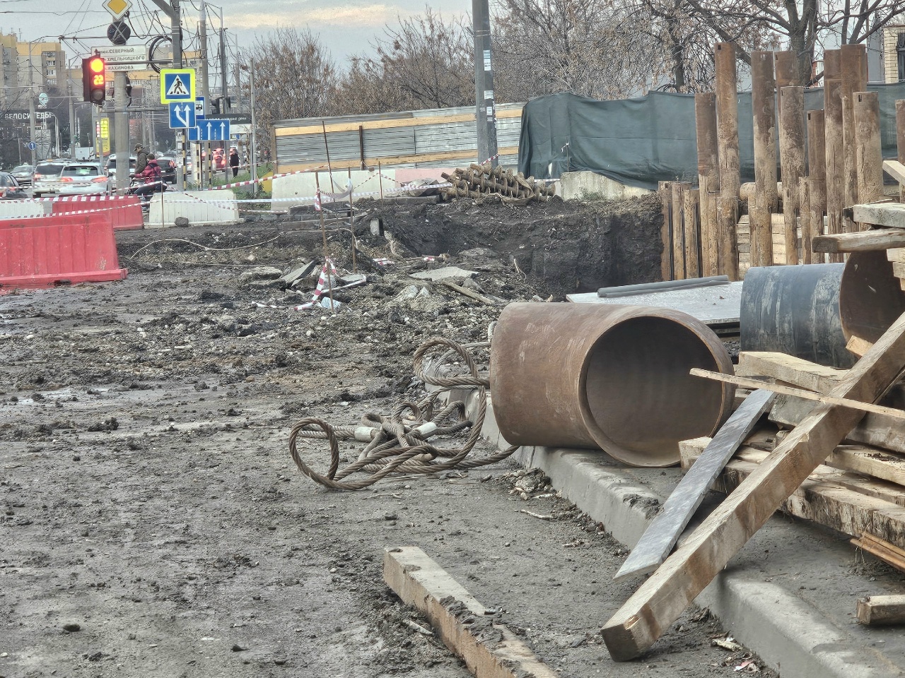 На противоположной, четной стороне, пока виден только котлован. Стоит экскаватор, территория огорожена, также ее опоясывает сигнальная лента. Четверо рабочих что-то пилили наверху.