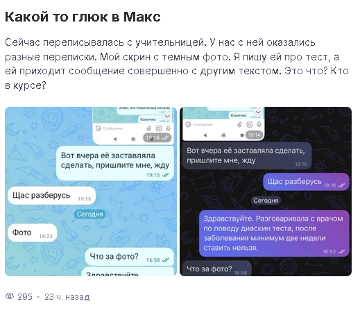 В Сети начали появляться описания похожих ситуаций. Анастасия из Тамбова переписывалась с учителем своей дочери, а на следующий день выяснилось, что у них совсем разные сообщения в одном и том же чате.