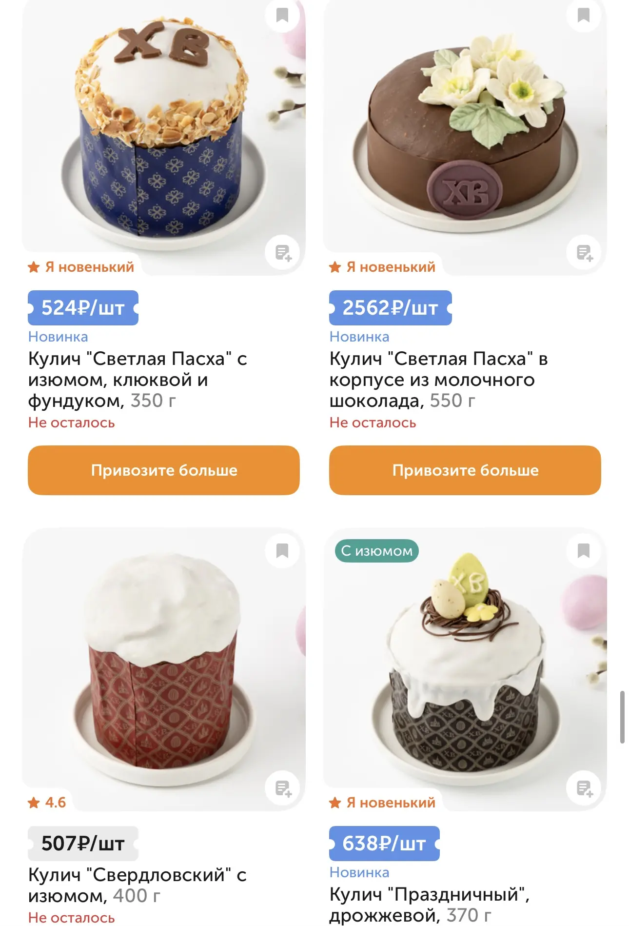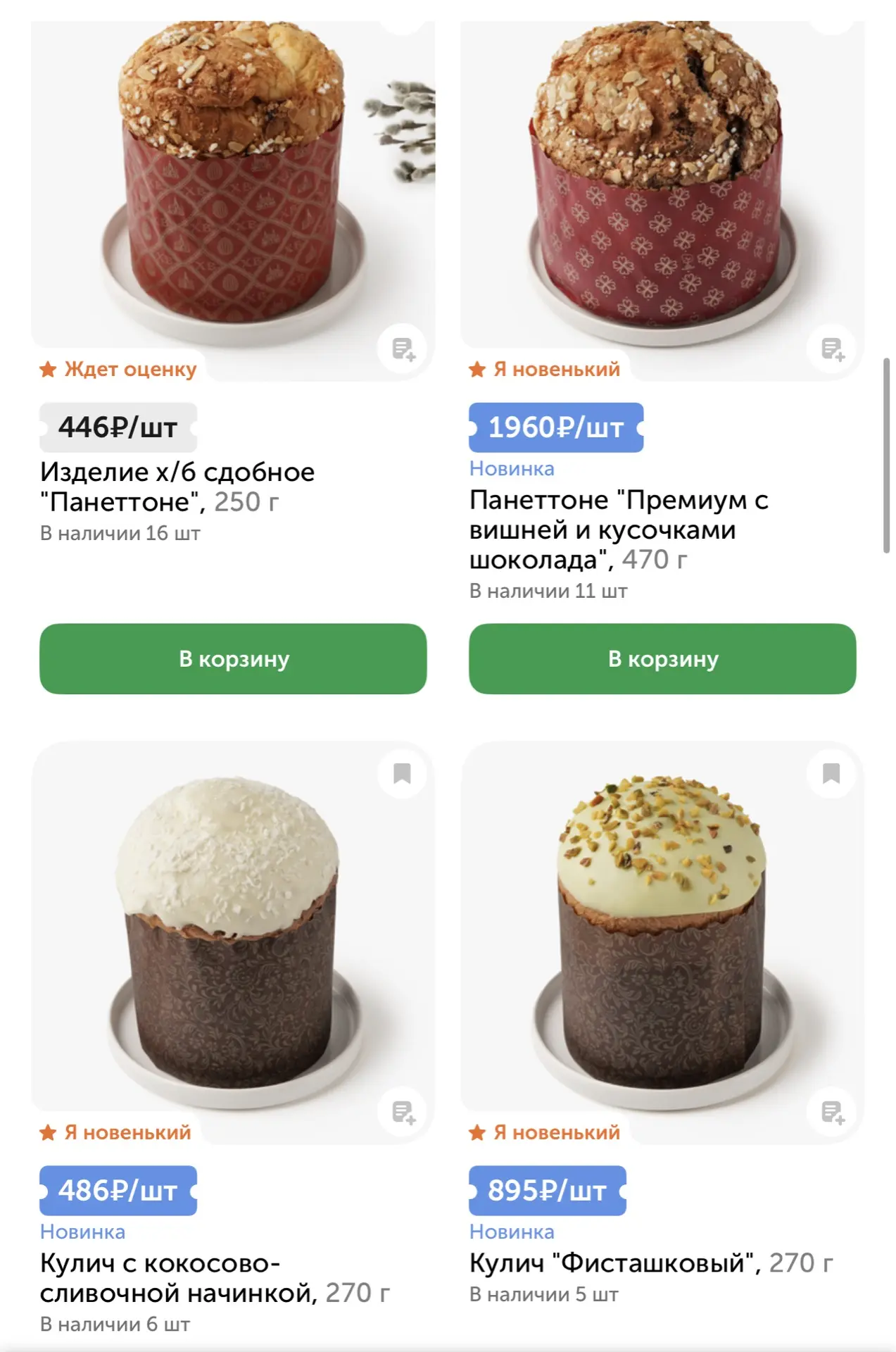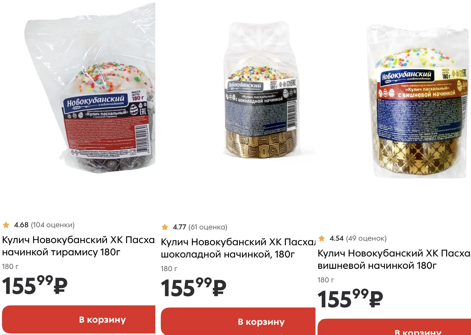 Сейчас, конечно, на полках магазинов можно встретить удивительные вкусовые сочетания, которые ушли за рамки привычного рецепта кулича. Так, в «Пятёрочке» продаются куличи с начинками тирамису, шоколадной, вишнёвой. 180 грамм - 156 рублей.