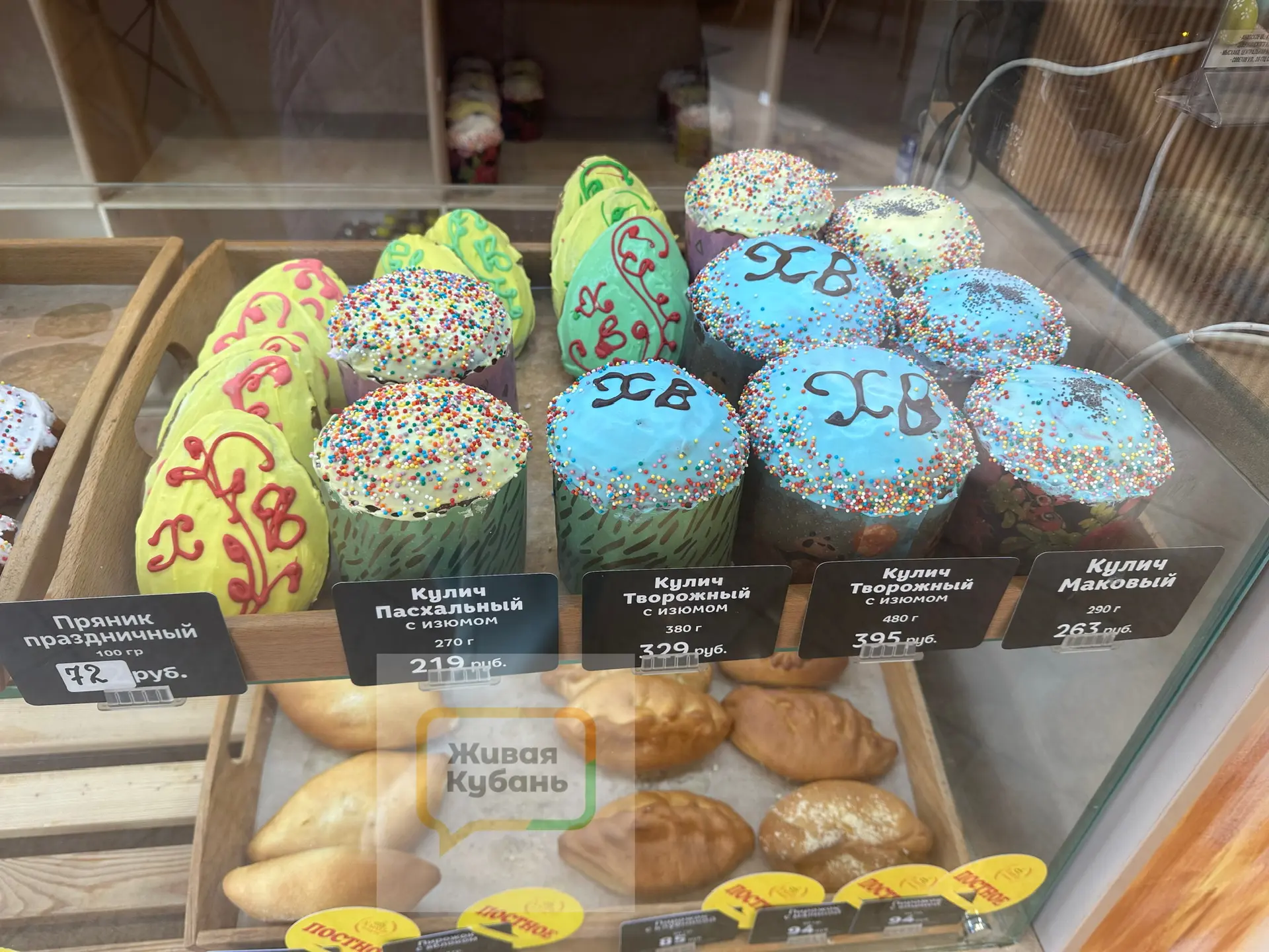Симпатичные куличи с цветными «шапочками» (голубыми, розовыми, жёлтыми), с щедрой посыпкой сверху и изюмом внутри имеют вполне приемлемые цены.