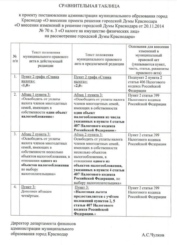 Автор идеи - департамент финансов краснодарской мэрии. В приложенной к уведомлению таблице чиновники ссылаются на статью 406 НК РФ, дающую право представительным органам муниципальных образований повышать налоговые ставки по своему усмотрению. При этом никаких обоснованных поводов для повышения не приводится. Некоторые депутаты уже подвергли инициативу департамента резкой критике.