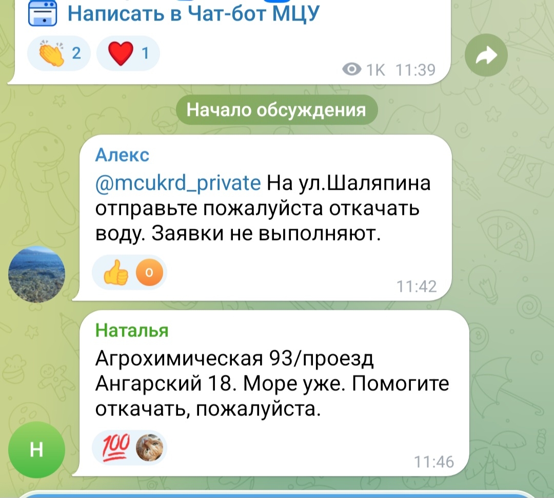 В микрорайоне Музыкальном, который «славится» на весь краевой центр своими нежелательными водоемами, работает водооткачивающая техника. При этом, в комментариях telegram-канала МЦУ жители жалуются, что оставленные заявки на откачку воды не выполняются.