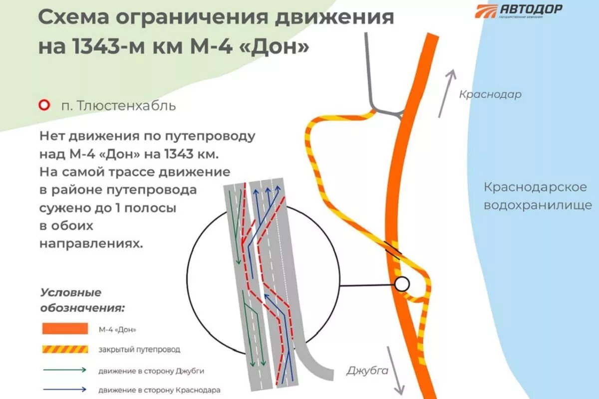 Водителям рекомендуется использовать объезд через Тлюстенхабль: при движении из Джубги необходимо будет совершить разворот на развязке в районе торгового центра «OZ Молл» на 1339-м км, а при выезде в сторону Краснодара – следовать через развязку возле посёлка Тугургой на 1346-м км.