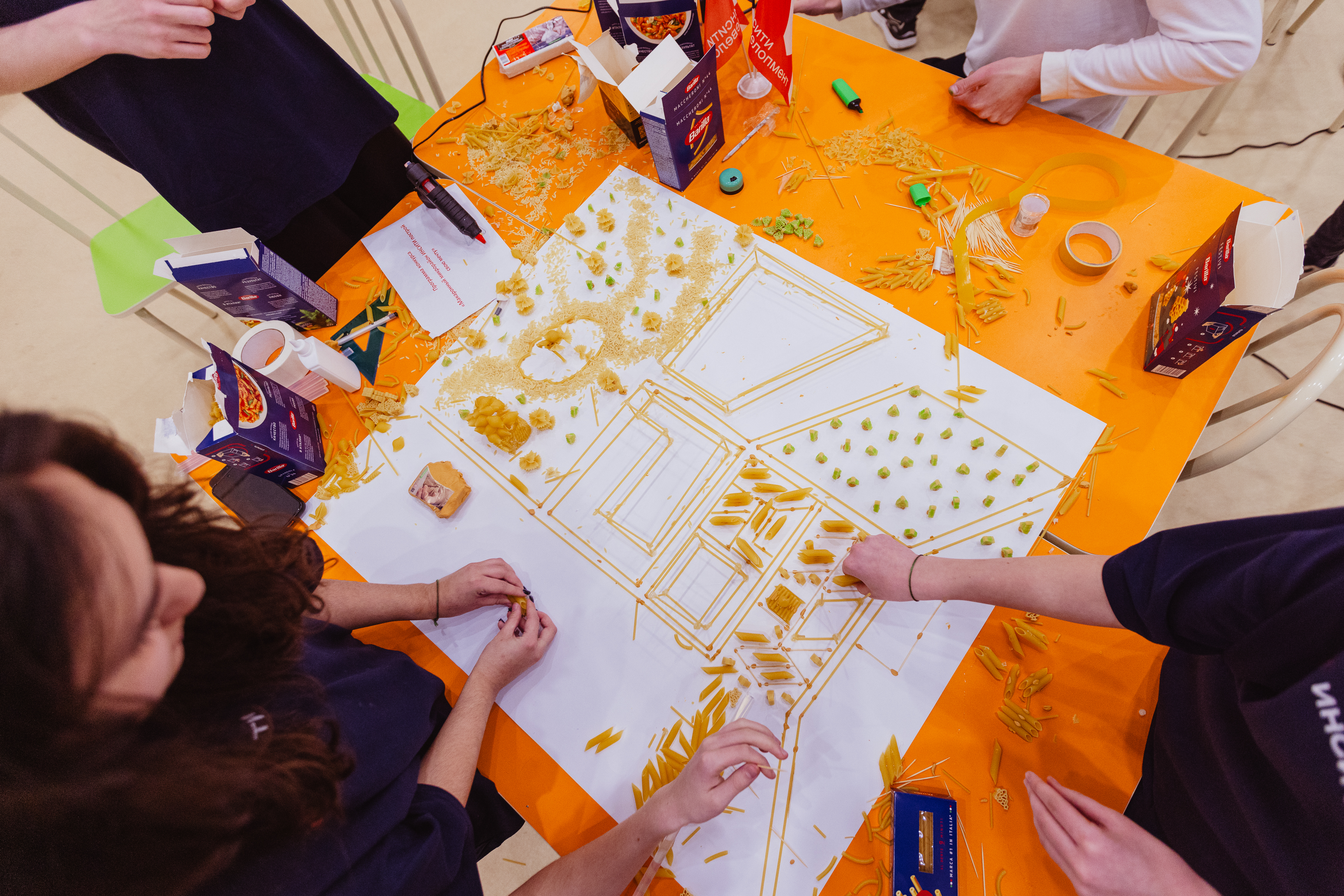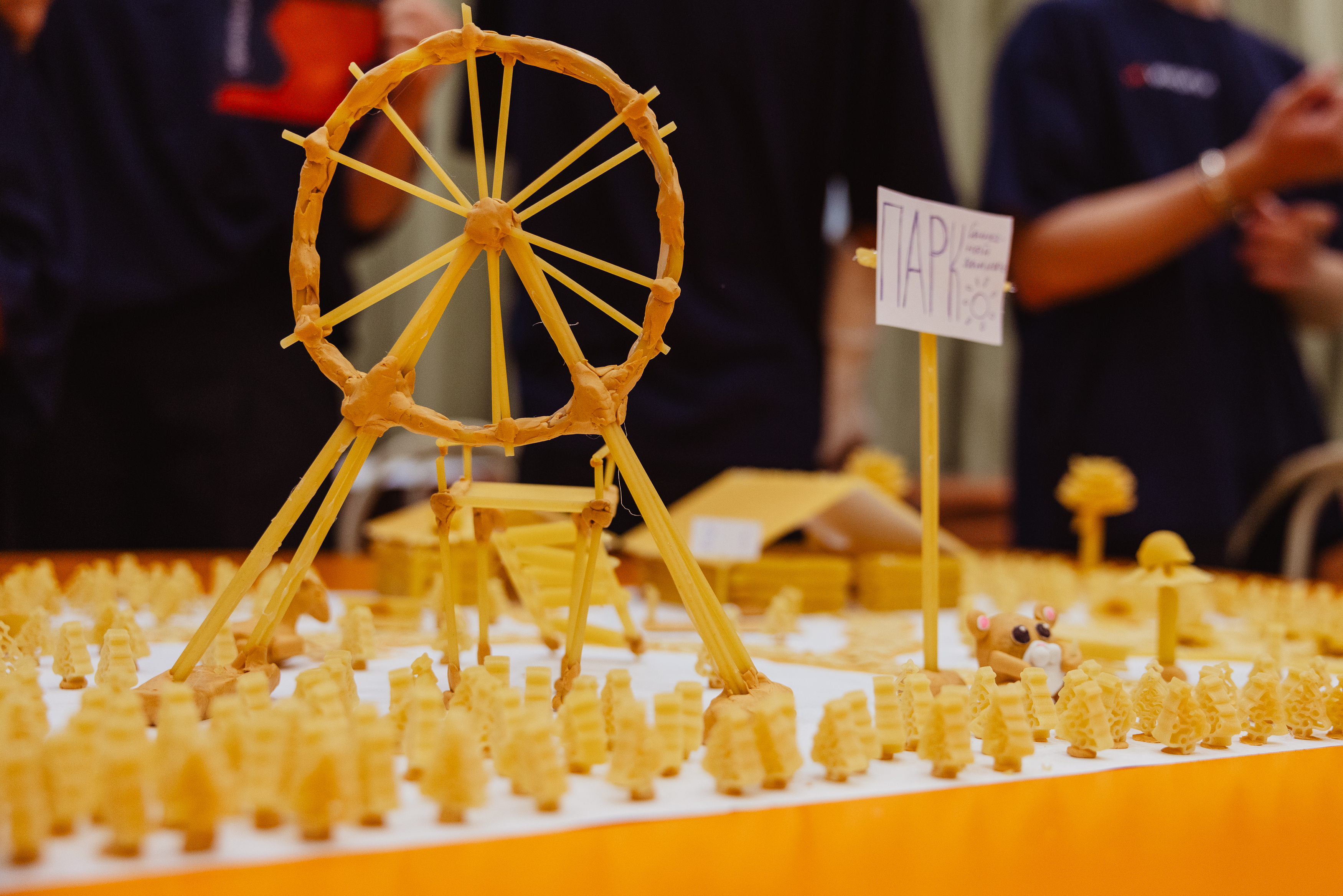 Школьникам предстояло проявить инженерные и конструкторские навыки, используя самые неожиданные материалы – обычные макароны разных форм и строительный пластилин. Задача участников – создать макет микрорайона, включающий в себя жилые дома, детский сад, школу, парк и другие объекты городской инфраструктуры.