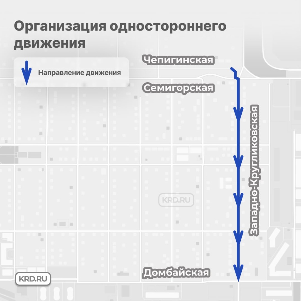В Краснодаре участок улицы Западно-Кругликовской станет односторонним. Изменения дорожного движения будут действовать на отрезке от улицы Чепигинской до улицы Домбайской по направлению движения к улице имени Героя Яцкова.