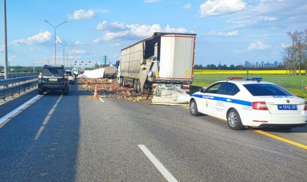 С серьезными проблемами столкнулись водители в Кореновском районе Кубани из-за ДТП с двумя большегрузами, перевозившими фрукты и овощи.
