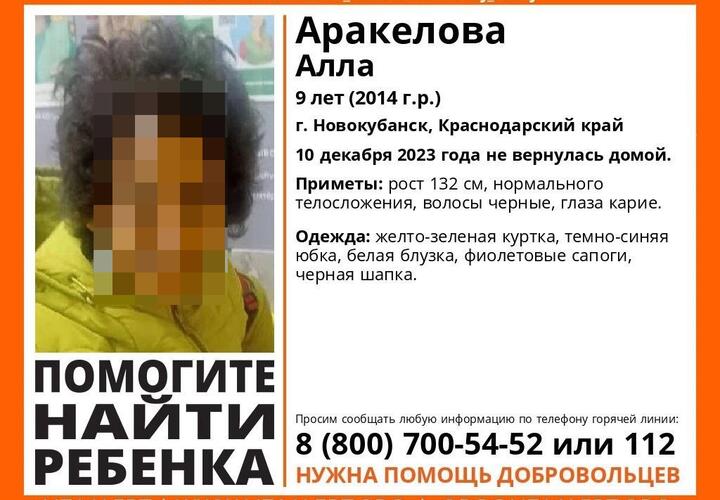 9-летняя девочка вышла из дома и не вернулась в Новокубанске. Аракелова Алла пропала вчера, но до сих пор о ее местонахождении и судьбе ничего не известно.