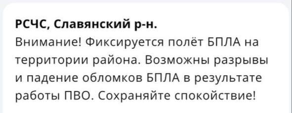 Над Славянским районном фиксируют полёт БПЛА! Об этом сообщили в официальном приложении «МЧС России». Возможно падение обломков дронов, предупреждают людей.
