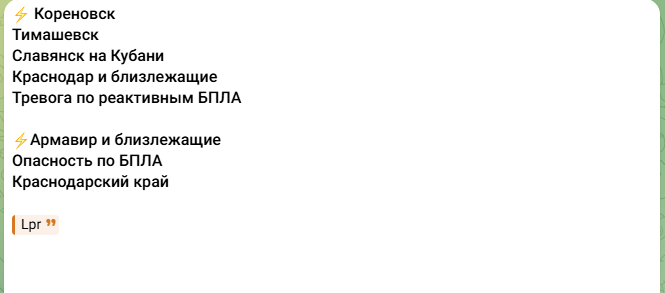 В мониторинговых telegram-каналах появилась информация, что Украина угрожает Краснодарскому краю реактивными беспилотниками.