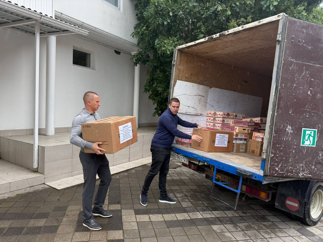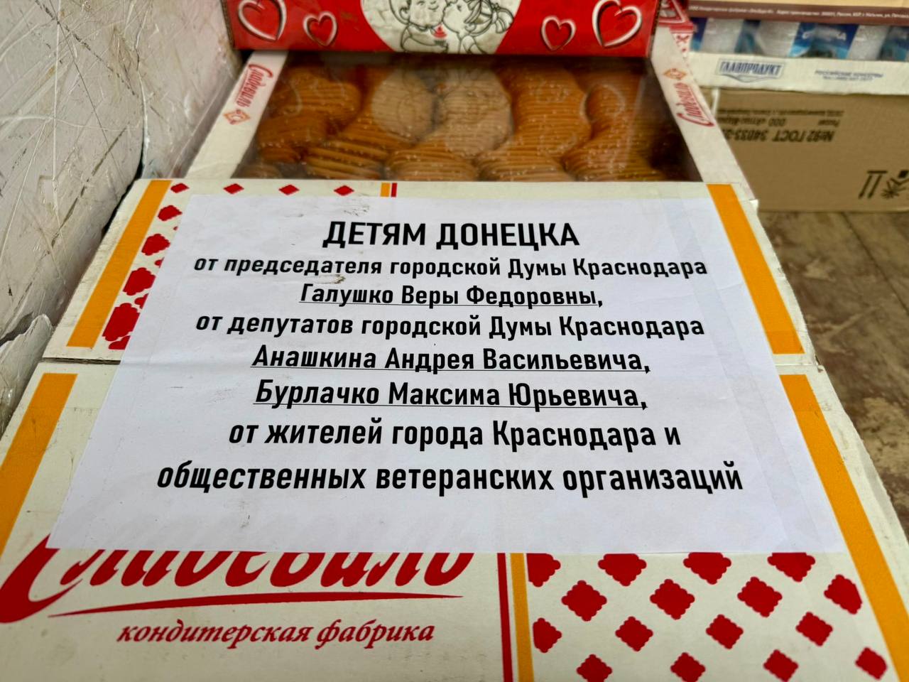 Собирая эту праздничную посылку для детей, депутаты обратились и к жителям Кубани. И посылки для детей пополнились домашней сдобой, различными канцтоварами, настольными играми, книгами, коробками с пластилином и наборами для творчества. Партию гуманитарной помощи сопровождал также представитель молодежного парламента Краснодара.