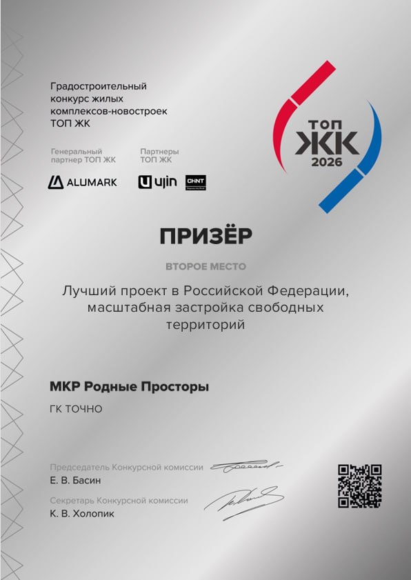 Мкр. «Родные Просторы» – один из самых титулованных жилых комплексов ТОЧНО –подтвердил высокий уровень, получив «серебро» премии в федеральной номинации «Лучший проект в Российской Федерации, масштабная застройка свободных территорий».