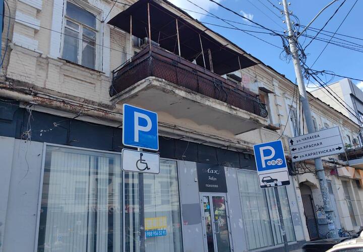 Обломки, падающие с балкона старого дома в центре Краснодара, угрожают прохожим