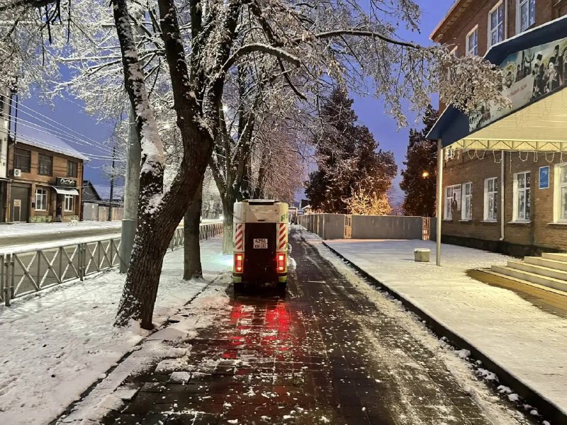 Белое полотно укрыло дороги Краснодара. Специалисты уже обработали трассы и тротуары от гололёда.