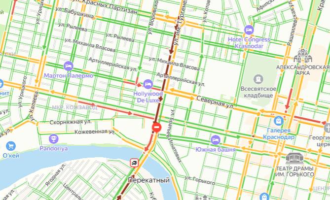 Большая пробка собралась на Тургеневском мосту. На пару километров до объекта, на столько же - после. Сейчас на пути в Краснодар придётся постоять около 40 минут, на выезде ситуация лучше - ожидание в заторе примерно 10 минут.